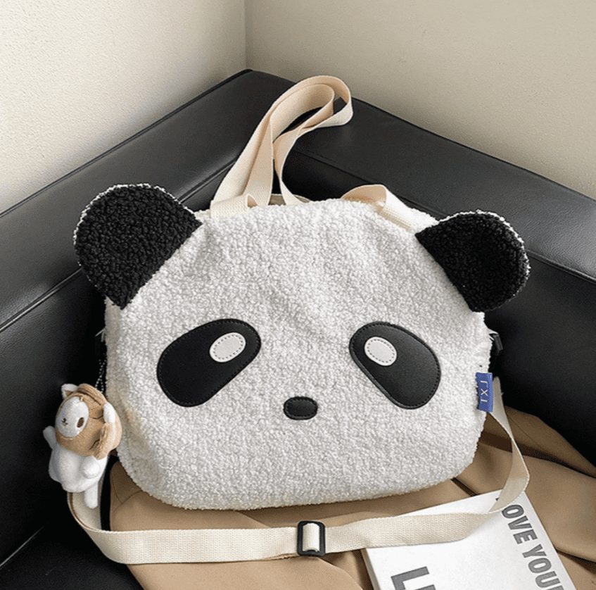 Large panda bag available in white/black and inverted color scheme. Made from plush material with high quality stitching.