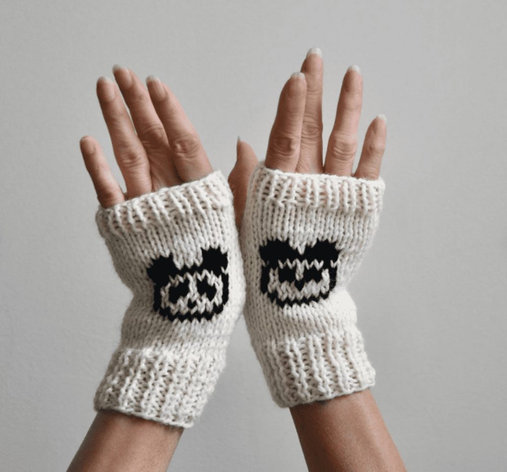 Hand made in New York City these hand knit fingerless gloves come complete with a simple panda face graphic on each hand. Made from a wool/acrylic blend for maximum durability and comfort.