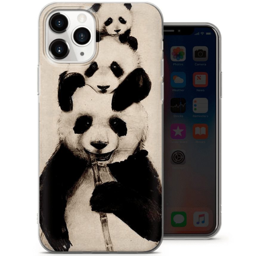 Available to fit a range of iPhones and Samsungs. Simple black and white design with a whole family of pandas stacked up on top of each other. Four other designs available through this product listing.