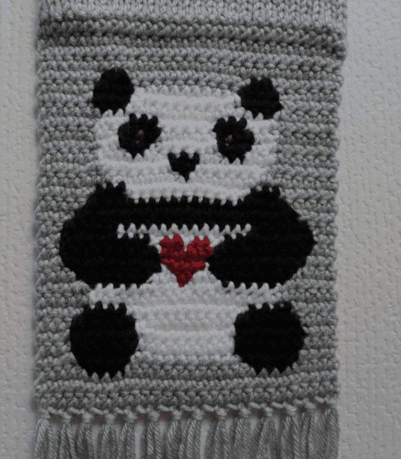 Hand made in silver grey color and featuring two adorable heart holding pandas at either end this unique scarf measures 157cm long and 15cm wide.