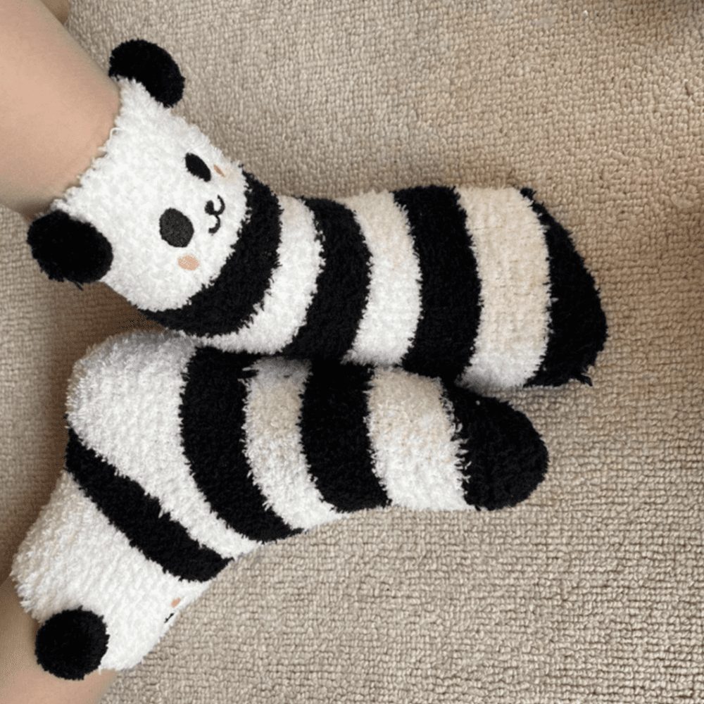 These are the socks every winter night in a chilly bed needs. Super cute black and white stripe design topped with a panda face and a pair of cute little ears on each sock.