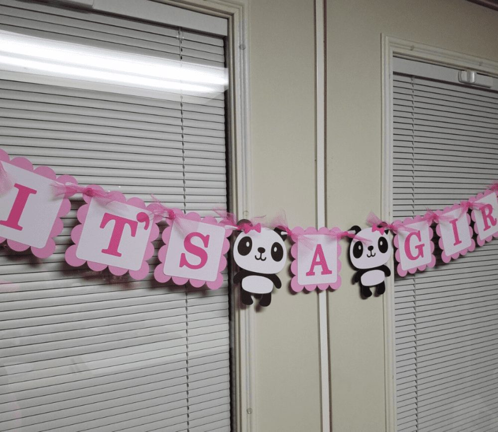 Approx. 4ft long featuring large ‘It’s a girl’ message in pink and white separated by two cute cartoon pandas with pink bows.