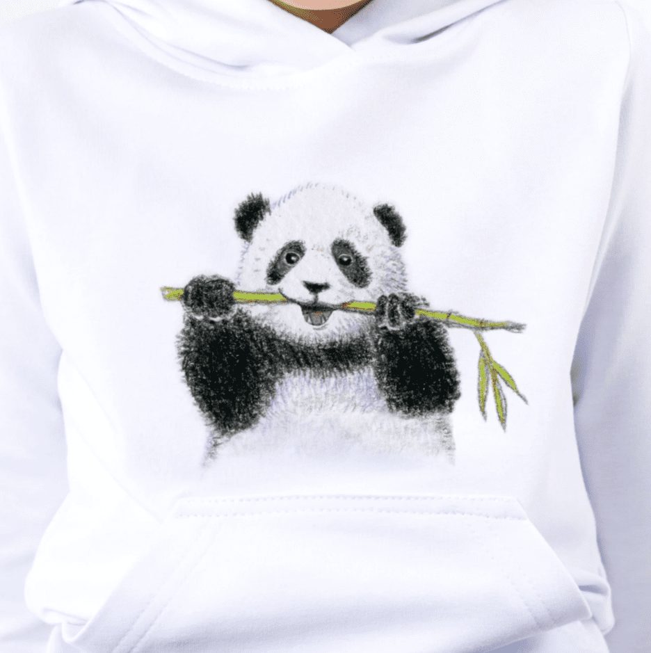 This hoodie features a cute panda design both back and front. Both in the same rough illustrated cartoon style. Both enjoying a bamboo snack!