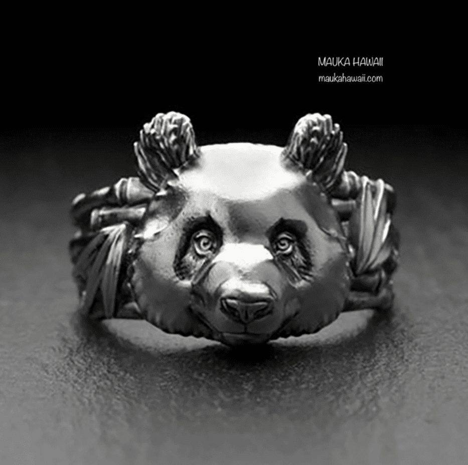 We love this bold piece absolutely COVERED in detail. Incredibly textured panda head complete with fluffy ears sits atop a bamboo shaped ring, all handmade by craftspeople.